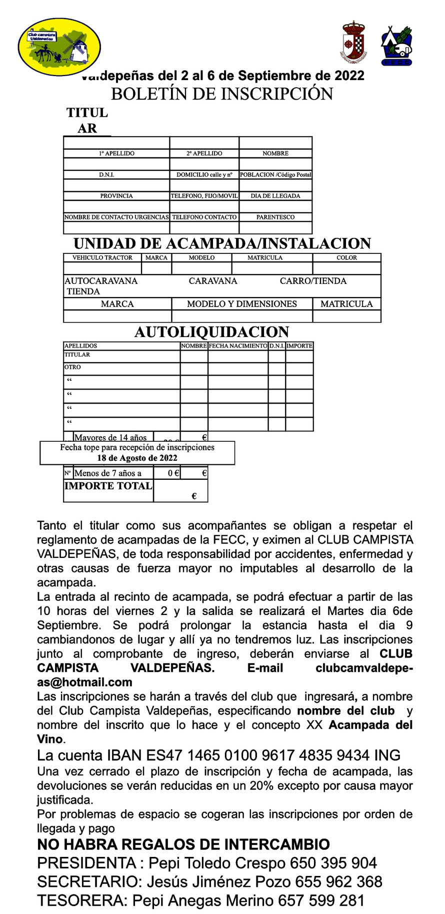 Os enviamos invitación para acudir a la XX acampada del vino del club campista Valdepeñas, que se celebrará del 2 al 6 de septiembre. Se adjunta también boletín de inscripción a la misma que debéis enviar cumplimentada, al correo electrónico que viene reflejado en el. Os pedimos como siempre máxima difusión para que los socios tengan la información y puedan acudir si pueden y quieren a este tipo de eventos organizados.